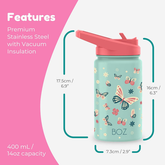 BOZ Kids 14oz Stainless Steel Insulated Water Bottle, Butterfly, Straw Lid, Leak-Proof, BPA-Free, Dishwasher-Safe