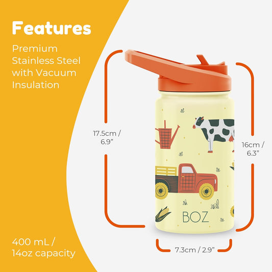 BOZ Kids 14oz Stainless Steel Insulated Water Bottle, Farm, Straw Lid, Leak-Proof, BPA-Free, Dishwasher-Safe