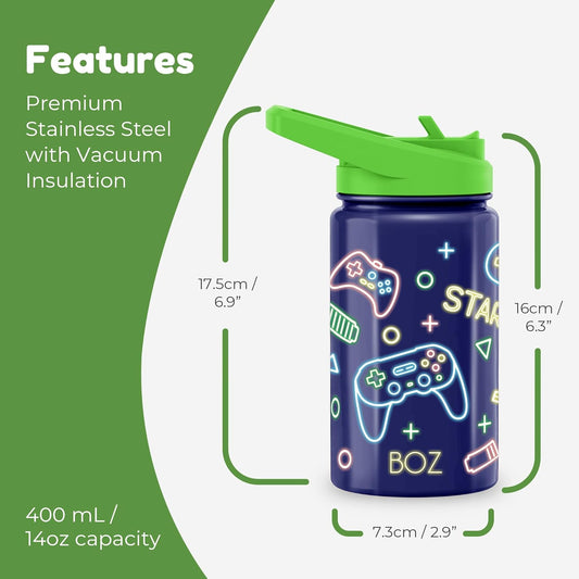 BOZ Kids 14oz Stainless Steel Insulated Water Bottle, Game, Straw Lid, Leak-Proof, BPA-Free, Dishwasher-Safe
