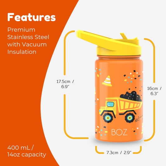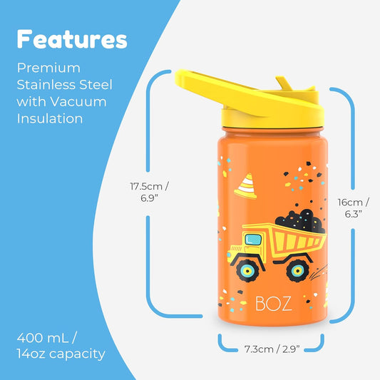 BOZ Kids 14oz Stainless Steel Insulated Water Bottle, Construction, Straw Lid, Leak-Proof, BPA-Free, Dishwasher-Safe