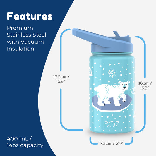 BOZ Kids 14oz Stainless Steel Insulated Water Bottle, Polar, Straw Lid, Leak-Proof, BPA-Free, Dishwasher-Safe