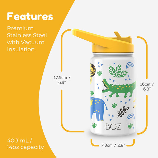 BOZ Kids 14oz Stainless Steel Insulated Water Bottle, Safari, Straw Lid, Leak-Proof, BPA-Free, Dishwasher-Safe