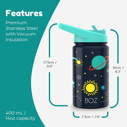 BOZ Kids 14oz Stainless Steel Insulated Water Bottle, Space, Straw Lid, Leak-Proof, BPA-Free, Dishwasher-Safe