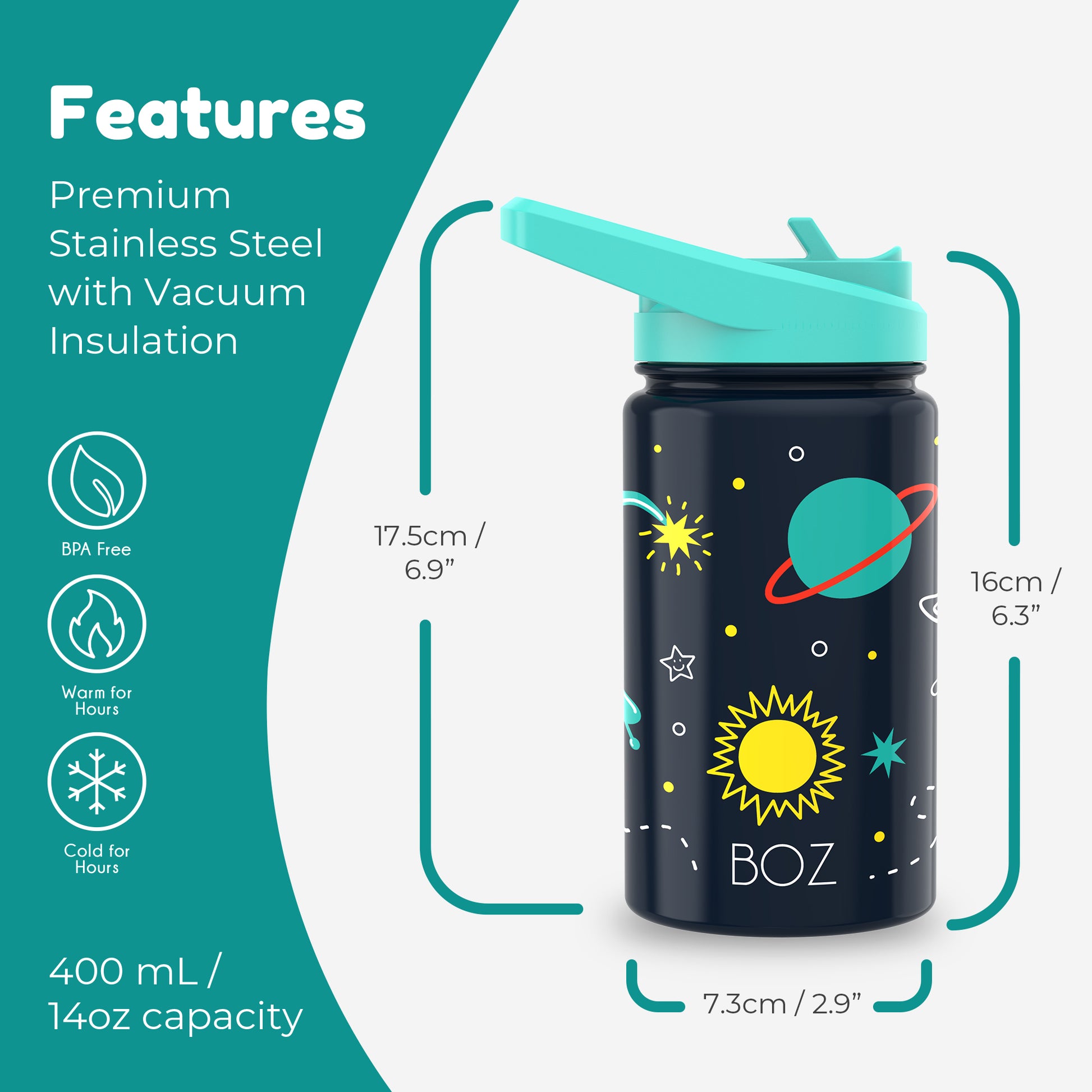 BOZ Kids 14oz Stainless Steel Insulated Water Bottle, Space, Straw Lid, Leak-Proof, BPA-Free, Dishwasher-Safe