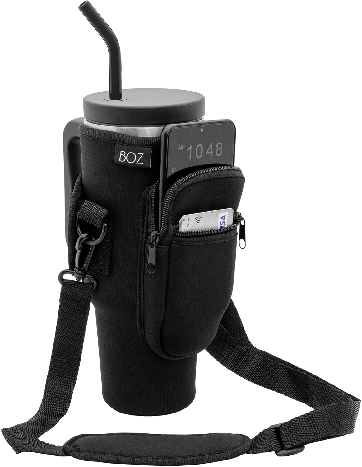 BOZ Water Bottle Bag with Phone Pocket - 1.2L/ 40oz Tumbler Carrier with Strap, Adjustable Water Bottle Holder Sling Bag, Water Bottle Carrier with Strap, Neoprene Protection (Black)