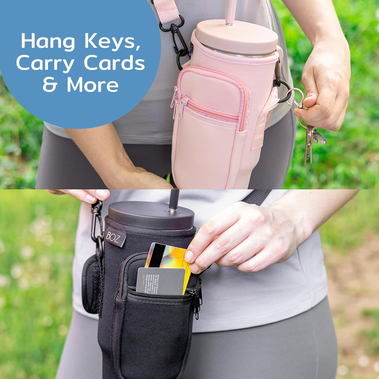 <p>This <b>tumbler holder with strap</b> features a secure Velcro enclosure to keep your bottle in place, while the removable clips provide multiple carrying options. The practical design includes pockets for phones up to 6.7" and essential cards, making it a multifunctional <b>water bottle purse crossbody</b>. Available in stylish Black, Pink, and Beige, this <b>water bottle holder bag</b> is perfect for both casual outings and adventurous hikes.</p>