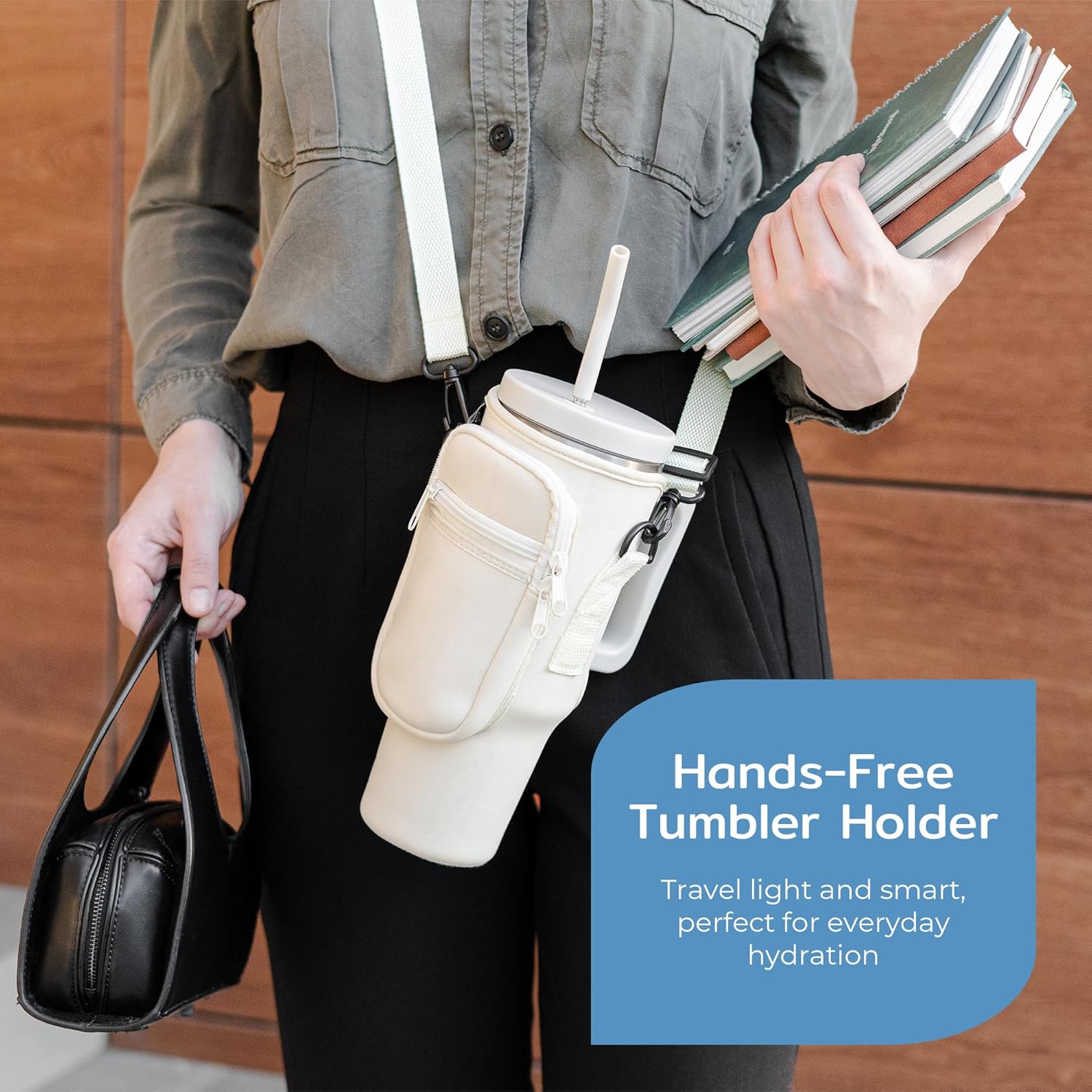 <p>This <b>tumbler holder with strap</b> features a secure Velcro enclosure to keep your bottle in place, while the removable clips provide multiple carrying options. The practical design includes pockets for phones up to 6.7" and essential cards, making it a multifunctional <b>water bottle purse crossbody</b>. Available in stylish Black, Pink, and Beige, this <b>water bottle holder bag</b> is perfect for both casual outings and adventurous hikes.</p>